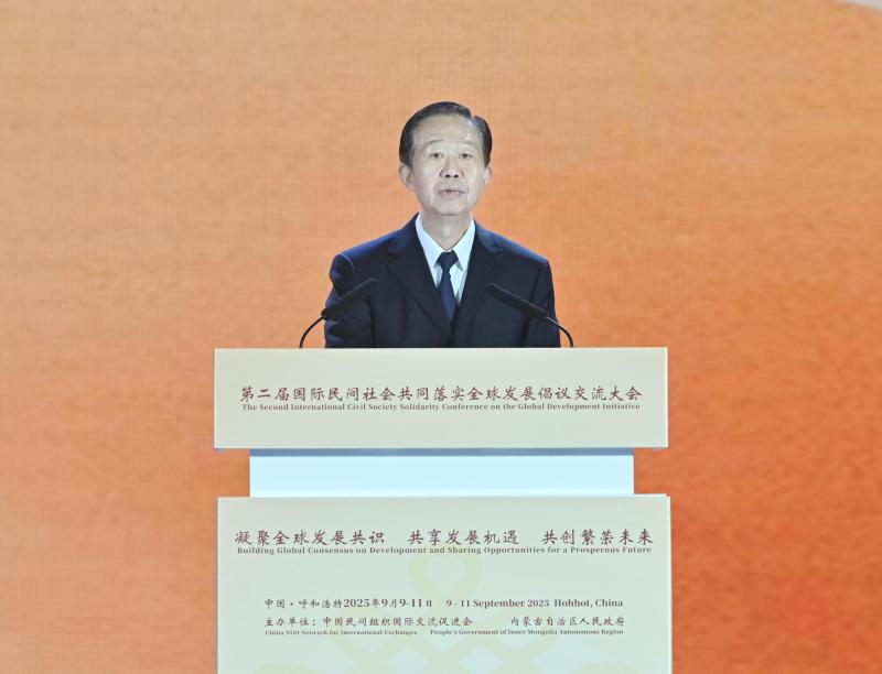 9月10日,內(nèi)蒙古自治區(qū)黨委書記、人大常委會主任孫紹騁在第二屆國際民間社會共同落實全球發(fā)展倡議交流大會開幕式上致辭。草原云·內(nèi)蒙古新聞網(wǎng)記者 馬建兵 攝