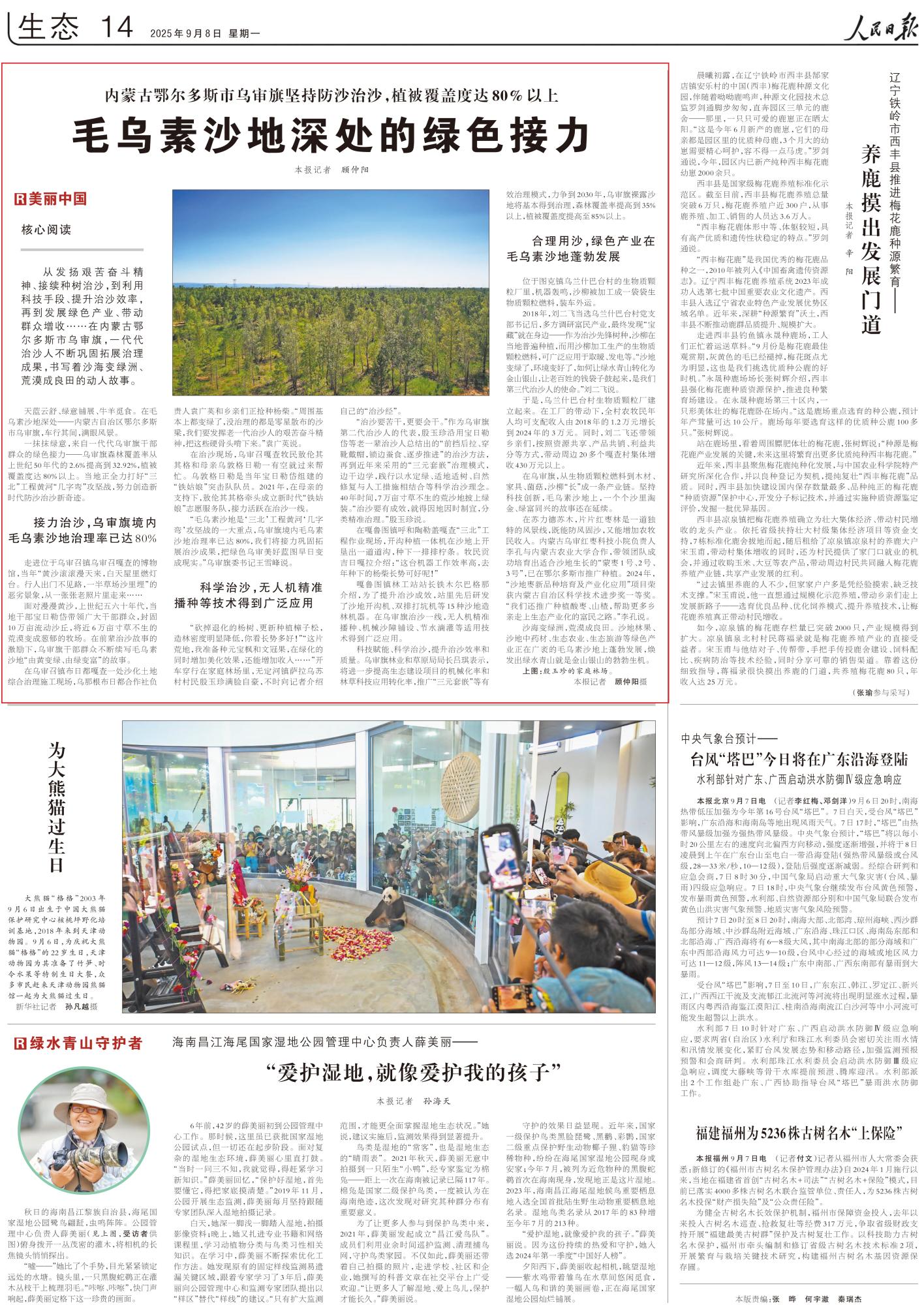 2025年9月8日《人民日報》第14版刊發(fā)了《內(nèi)蒙古鄂爾多斯市烏審旗堅(jiān)持防沙治沙,植被覆蓋度達(dá)80%以上 毛烏素沙地深處的綠色接力》的文章,報道了在內(nèi)蒙古鄂爾多斯市烏審旗,一代代治沙人不斷鞏固拓展治理成果,書寫著沙海變綠洲、荒漠成良田的動人故事。沙地林果、沙地中藥材、生態(tài)農(nóng)業(yè)、生態(tài)旅游等綠色產(chǎn)業(yè)正在廣袤的毛烏素沙地上蓬勃發(fā)展,煥發(fā)出綠水青山就是金山銀山的勃勃生機(jī)。
