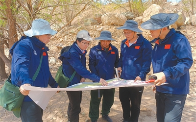 楊彪(左二)與團(tuán)隊(duì)工作人員在分析礦脈走向。孫濤 攝(人民視覺)