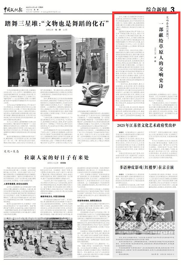 2025年12月4日《中國文化報》第3版刊發(fā)了《交響套曲《藍(lán)圖》:一部獻(xiàn)給草原人的交響史詩》的文章,報道了近日,內(nèi)蒙古藝術(shù)劇院委約作曲家方崠清作曲,曾偉擔(dān)任文學(xué)撰稿、作詞的大型交響套曲《藍(lán)圖》,在位于呼和浩特市的內(nèi)蒙古烏蘭恰特大劇院上演,指揮家黃屹執(zhí)棒內(nèi)蒙古藝術(shù)劇院交響樂團(tuán)演奏家合力獻(xiàn)藝,用國際語匯講述新時代內(nèi)蒙古發(fā)展故事。