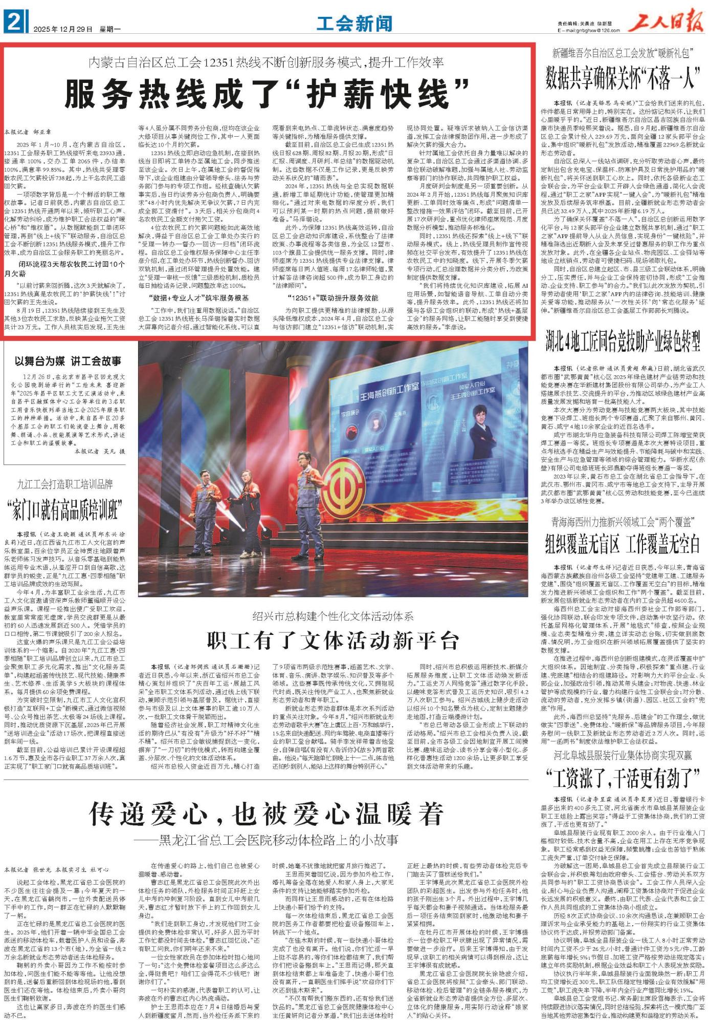 2025年12月29日,《工人日報》第2版刊發(fā)題為《服務(wù)熱線成了“護薪快線”》的文章,報道了內(nèi)蒙古自治區(qū)總工會12351熱線開通兩年以來,傾聽職工心聲、化解勞動糾紛,成為維護職工合法權(quán)益的“暖心橋”和“維權(quán)盾”。其中,熱線共受理零散農(nóng)民工欠薪投訴738起,為上千名農(nóng)民工追回欠薪。