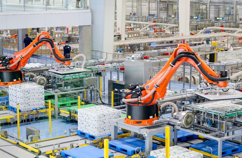 伊利現代智慧健康谷液態(tài)奶全球智造標桿基地內,機械手在碼放牛奶。