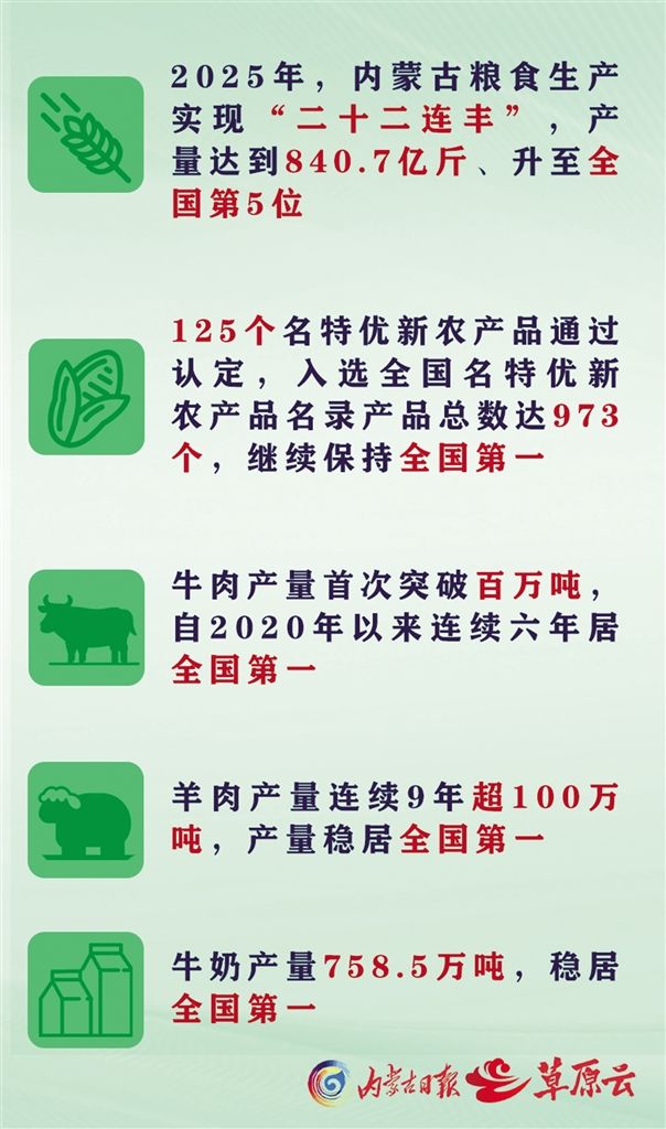向陽村的生動實踐,體現(xiàn)出內蒙古現(xiàn)代農(nóng)牧業(yè)蓬勃發(fā)展的堅實步伐?;赝?025年,“糧倉”根基更加堅實:糧食播種面積穩(wěn)定在1億畝以上,糧食生產(chǎn)實現(xiàn)“二十二連豐”,產(chǎn)量達到840.7億斤、升至全國第5位;向日葵、谷子、大豆等品種選育全國領先;125個名特優(yōu)新農(nóng)產(chǎn)品通過認定,入選全國名特優(yōu)新農(nóng)產(chǎn)品名錄產(chǎn)品總數(shù)達973個,繼續(xù)保持全國第一。