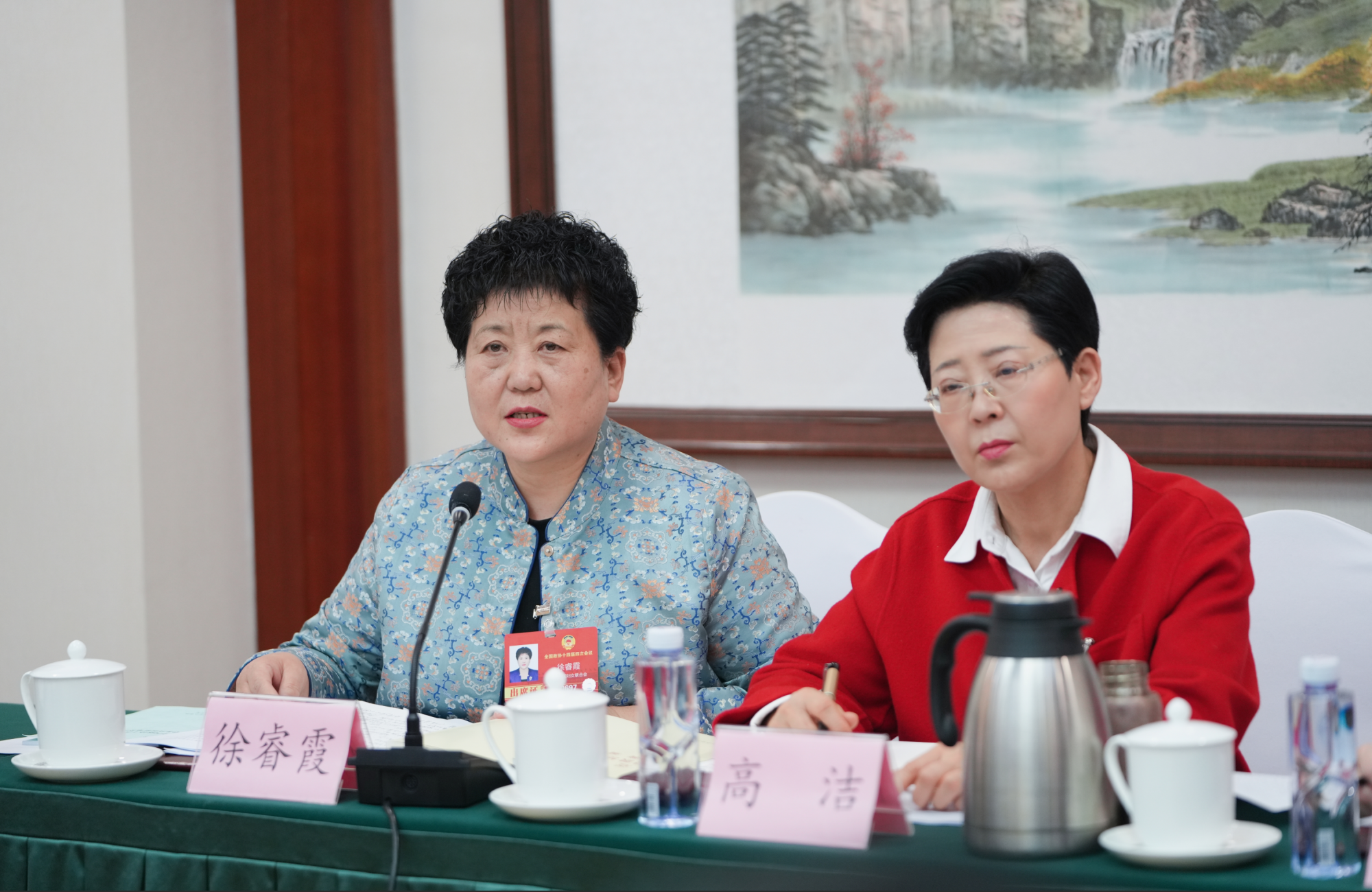 3月5日,住內(nèi)蒙古全國政協(xié)委員徐睿霞(左)建議,設(shè)立烏梁素海生態(tài)保護與系統(tǒng)治理專項基金,開展跨學科聯(lián)合攻關(guān),重點研發(fā)低成本、生態(tài)友好的底泥污染治理與資源化利用技術(shù)。草原云記者