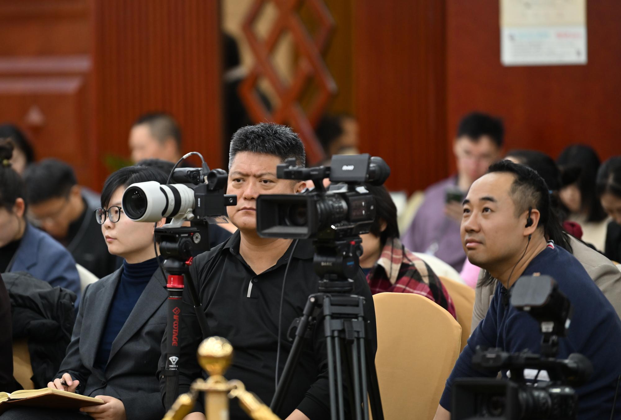 內(nèi)蒙古代表團(tuán)開放團(tuán)組活動(dòng)現(xiàn)場(chǎng),記者們架起“長(zhǎng)槍短炮”,現(xiàn)場(chǎng)快門聲此起彼伏。草原云記者 馬建兵 攝