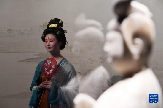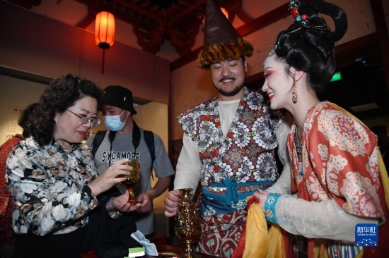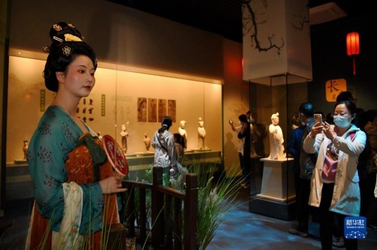 5月22日晚,在西安博物院《長安有故里——絲路少年大唐行》展覽上,身著復(fù)原唐裝的演員與游客互動。
