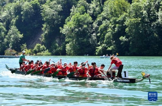 6月25日,在瑞士埃格利紹,瑞士蘇黎世州華僑華人組織的“龍戰(zhàn)隊(duì)”參加賽龍舟活動(dòng)。