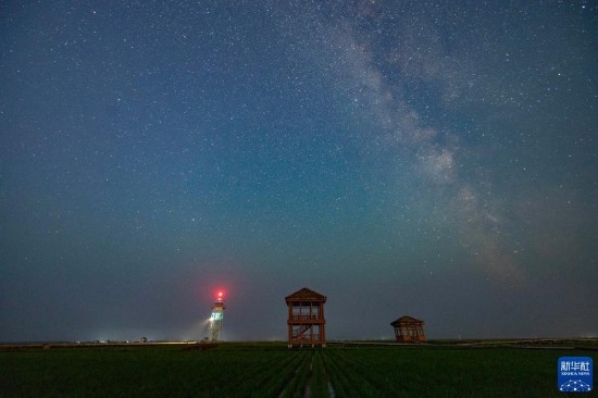 夏日夜晚,黑龍江省富錦市萬畝水稻公園的稻田之上星空璀璨,美麗壯觀。