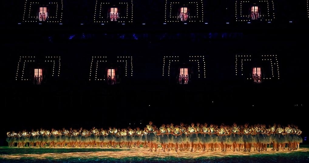 歌聲高潮處,觀眾席中近百扇“幸福之門”同時(shí)開啟。全場(chǎng)萬(wàn)人合唱,現(xiàn)場(chǎng)每一名觀眾都成為開幕式“主角”,傳達(dá)“亞洲一家攜手同行”的美好愿望。