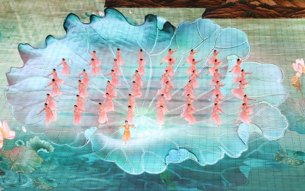 地屏上,錯(cuò)落有致的立體山水映襯著江南朦朧的裸眼3D視效,營(yíng)造出輕煙繚繞、水光瀲滟的江南畫境。國(guó)風(fēng)男子揮毫作畫,風(fēng)雅錢塘展現(xiàn)在觀眾眼前。煙雨西湖上,碩大的蓮葉舒展,清雅雋秀的女子翩然起舞,仿若盛開的蓮花。