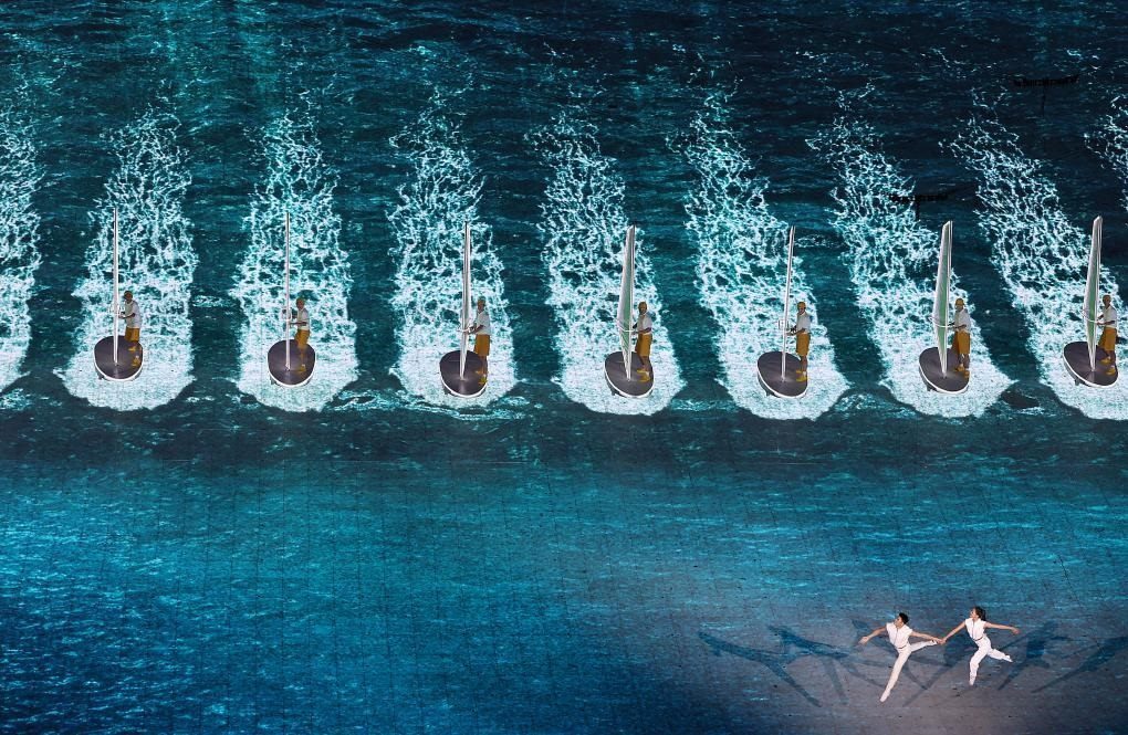 本屆亞運(yùn)會(huì)首次將3D雙威亞技術(shù)應(yīng)用于大型運(yùn)動(dòng)場(chǎng)中。立體飛旋于空中的男女演員與潮共舞,吊著威亞的他們?cè)诳罩型瓿闪烁鞣N高難度動(dòng)作,并與地屏中的浪潮實(shí)時(shí)互動(dòng),踏浪而行,成就了科技與藝術(shù)完美融合。