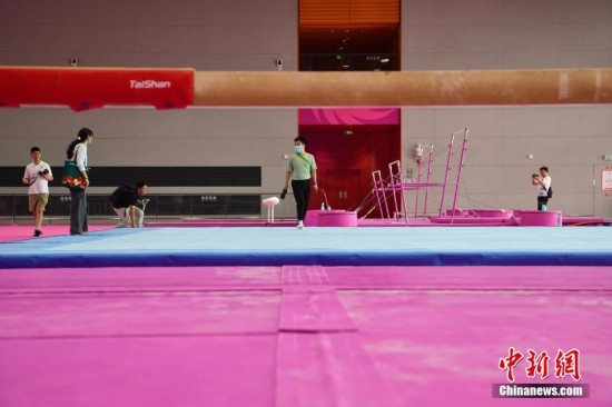 圖為媒體記者在體操比賽訓(xùn)練場(chǎng)探訪。