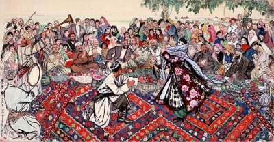 繞過紅色展墻,黃胄于1962年創(chuàng)作的《豐樂圖》赫然在目,拉開了展覽第一篇章的序幕?;▓F(tuán)錦簇的地毯上擺滿瓜果,人們圍坐在一起載歌載舞,歡慶豐收。畫面中的眾多人物雖姿態(tài)各異,但都喜笑顏開,感染著觀者。作品描繪出熱烈的慶祝場(chǎng)面,富有濃郁的地域特色,是新疆各族人民團(tuán)結(jié)和睦、意氣風(fēng)發(fā)的生動(dòng)寫照。