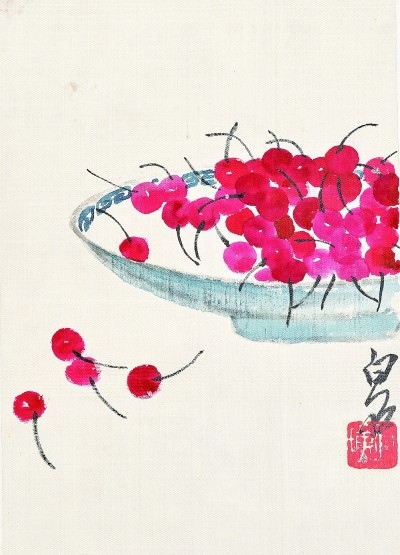 展柜中,不大的冊(cè)頁引得眾人圍觀。顆顆櫻桃被齊白石描繪得鮮嫩欲滴,它們擠在一個(gè)素樸的青花瓷盤中,還有幾顆散落在外,尤其鮮亮奪目?!侗P中櫻桃》是齊白石《聚珍十開冊(cè)》中的一幅,作于20世紀(jì)30年代。在這套冊(cè)頁中,無論是荷花游魚、麥穗螞蚱還是汀渚魚鷹,都在齊白石筆下顯得格外逼真?zhèn)魃瘛?/p>