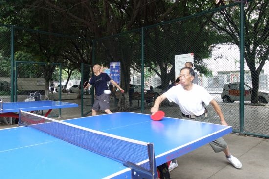 家住茶店子街道奧林社區(qū)的周開勝今年52歲,精神頭十足。早上8點,記者在一個老居民區(qū)中心的乒乓球桌見到周開勝時,他已是大汗淋漓。他和球友們6點半就已經(jīng)“開戰(zhàn)”了。