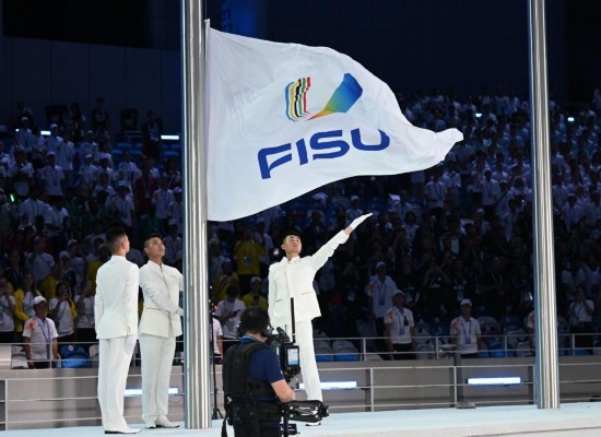 7月28日,國(guó)際大學(xué)生體育聯(lián)合會(huì)會(huì)旗在開幕式上升起。新華社記者胥冰潔攝