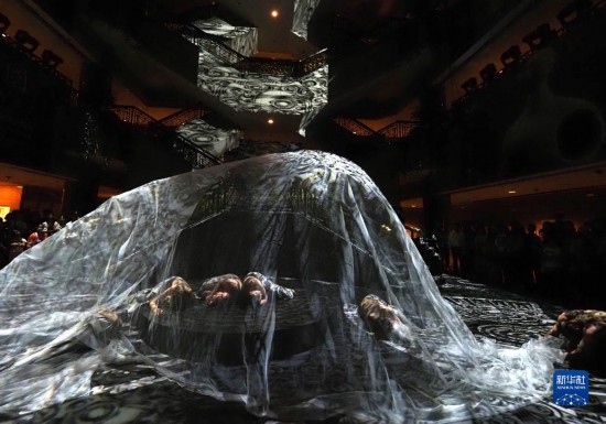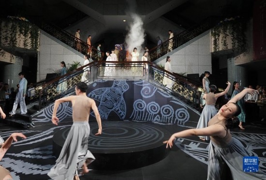 當日,上海博物館攜手杭州良渚遺址管理區(qū)管理委員會推出“研色·良渚之夜”沉浸式綜合藝術秀演出。作為“何以中國”系列大展的第二展“實證中國:崧澤·良渚文明考古特展”的活動之一,“研色·良渚之夜”采用現(xiàn)代舞、服裝秀、音樂秀和數(shù)字投影燈光秀等多種舞臺藝術形式,結合良渚核心色彩和文化元素,讓觀眾沉浸式體驗良渚穿越五千年的美學文化。新華社記者 任瓏 攝
