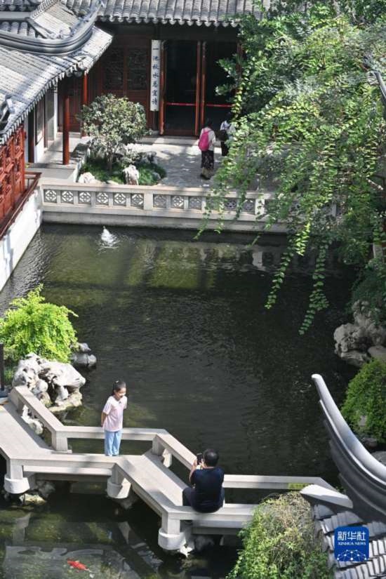 8月28日,參觀者在中國(guó)園林博物館鏡影亭參觀。