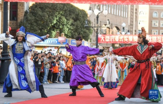10月2日,在烏魯木齊大巴扎步行街,演員在表演節(jié)目。