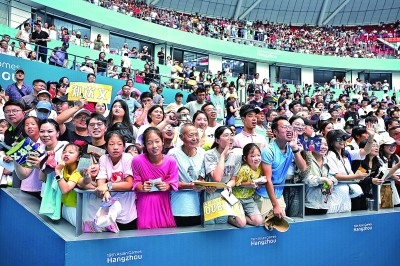9月29日,杭州亞運會網(wǎng)球女子單打決賽現(xiàn)場,觀眾在歡呼。本報記者陳城攝 光明圖片