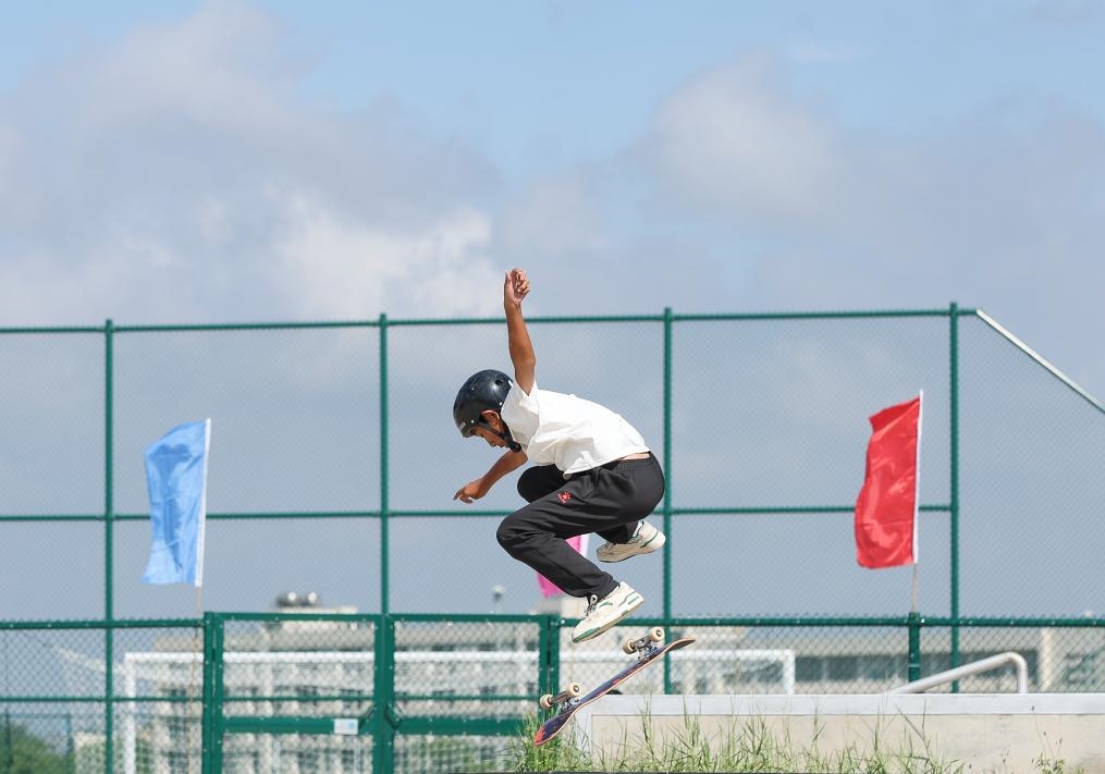 11月4日,武漢市選手詹何在第一屆全國(guó)學(xué)生(青年)運(yùn)動(dòng)會(huì)滑板男子街式?jīng)Q賽中奪冠。新華社記者 胡星宇 攝