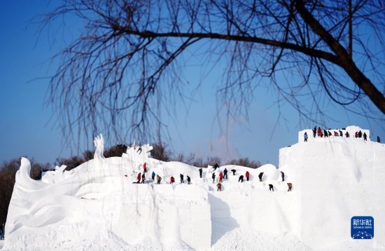 12月19日,雪雕師在創(chuàng)作雪雕作品《萬象更新》。