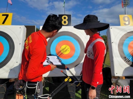 國家體育訓(xùn)練南方基地(海南白沙·綜合),一輪射箭之后,運(yùn)動(dòng)員在查看中靶情況。中新網(wǎng)記者王曉斌攝