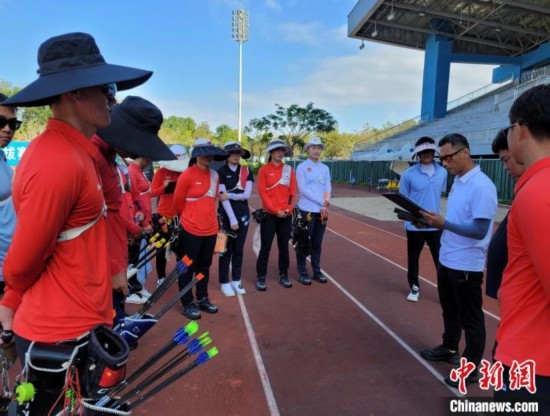 國家體育訓(xùn)練南方基地(海南白沙·綜合),國家射箭隊(duì)教練團(tuán)隊(duì)在點(diǎn)評(píng)運(yùn)動(dòng)員當(dāng)日的訓(xùn)練表現(xiàn)。中新網(wǎng)記者王曉斌攝