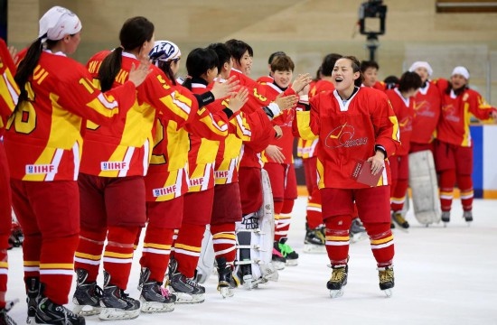2015年4月11日,中國隊球員齊雪婷(右前)在獲頒本場最佳球員后與隊友擊掌慶祝。當日,在北京舉行的2015國際冰聯(lián)女子冰球世錦賽甲級B組比賽中,中國隊以4比3戰(zhàn)勝意大利隊。新華社記者李明攝