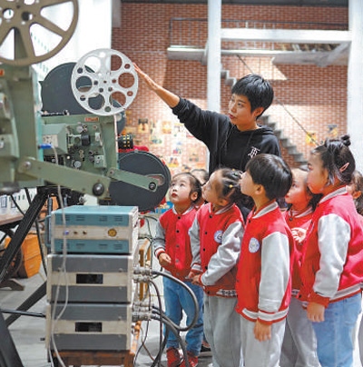 湖州市南潯鎮(zhèn)橫街電影博物館內(nèi),老師帶領(lǐng)孩子們了解電影放映機。張 斌攝