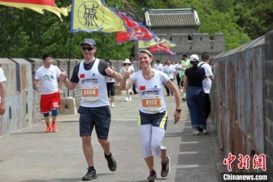 2023年5月21日,黃崖關長城國際馬拉松賽在天津市薊州區(qū)鳴槍開跑。圖為國外選手在比賽中穿越黃崖關長城。張彥 攝