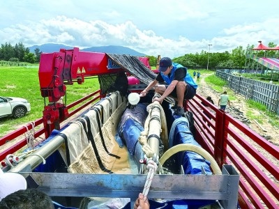 轉(zhuǎn)移“海棠”期間,工作人員不斷向它身上潑灑海水,使其皮膚保持濕潤。