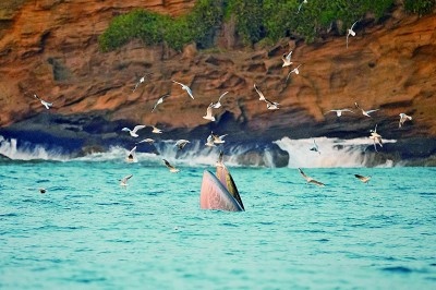 布氏鯨在廣西潿洲島海域浮出水面捕食。