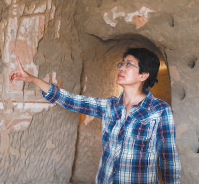克孜爾石窟內(nèi),趙莉(見(jiàn)圖)對(duì)著壁面上的切割痕跡,與電腦里的數(shù)百?gòu)堈掌瑏?lái)回比對(duì),題材內(nèi)容、顏色、紋飾圖案,都要一一對(duì)應(yīng)。突然,腦海中一張照片精準(zhǔn)鑲嵌進(jìn)了缺失的那塊壁面——這樣的“靈感突現(xiàn)”,源于她對(duì)每個(gè)洞窟每幅壁畫以及被揭取痕跡的熟悉程度。在克孜爾石窟群穿梭了32年,作為克孜爾石窟研究院研究館員,每一個(gè)洞窟都深深刻印在了她的腦海中。