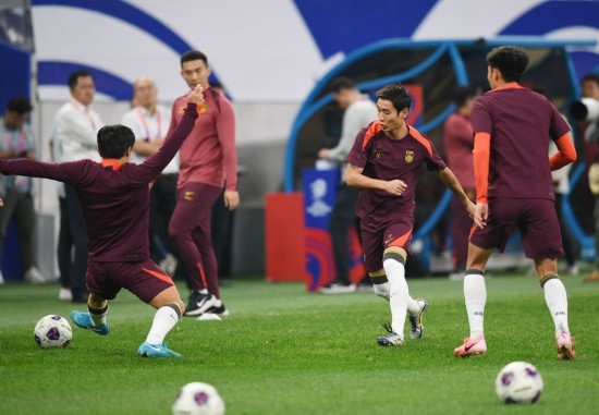 10月14日,中國隊(duì)球員韋世豪(中)在訓(xùn)練中。當(dāng)日,中國國家男子足球隊(duì)在山東青島進(jìn)行賽前訓(xùn)練。新華社記者 李紫恒 攝