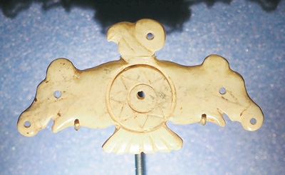 玉鷹是凌家灘文化最具代表性的器物之一。鷹側(cè)首傲視,雙翅張開,翅端各為一豬首形象,可能以豬作為財(cái)富的象征。鷹腹刻八角星紋,這種紋樣在凌家灘出土的玉版和新石器時(shí)代眾多陶器上都有出現(xiàn)。這件玉鷹可能是舉行祭祀儀式時(shí)所用之物,鷹、豬、八角星紋集于一器,體現(xiàn)了先民崇尚萬(wàn)物有靈的宇宙觀。