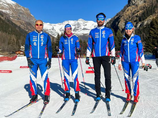 2022年1月24日,泰國越野滑雪隊運動員卡倫·尚隆(左二)、馬克·尚?。ㄗ笕┡c父母在歐洲備戰(zhàn)訓(xùn)練時合影。新華社發(fā)(受訪者供圖)