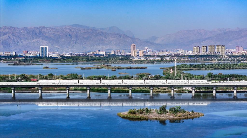 2024年10月3日,一列動(dòng)車組列車行駛在包銀高鐵惠銀段石嘴山特大橋上(無人機(jī)照片)。新華社記者馮開華攝
