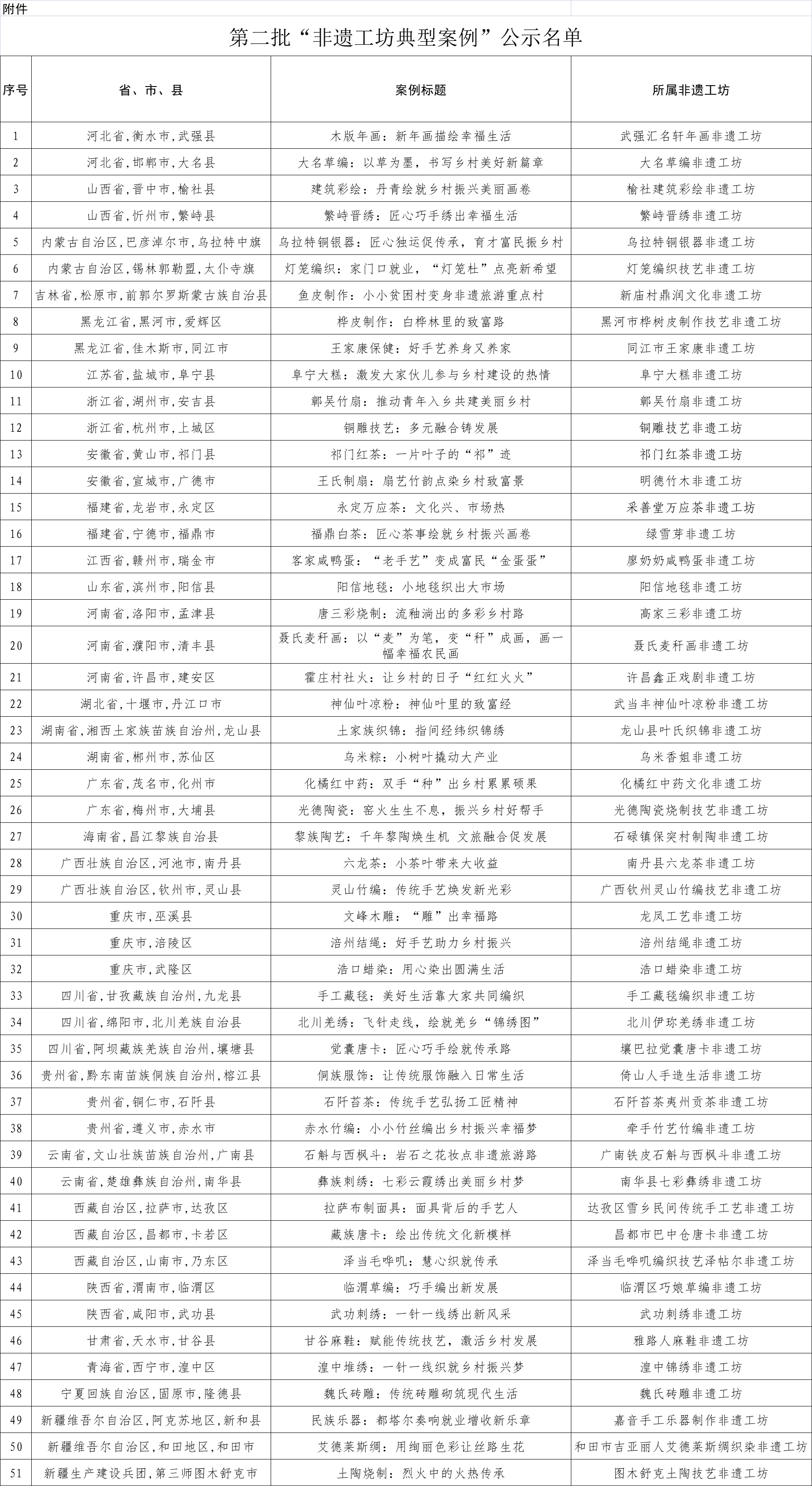 人民網(wǎng)北京3月19日電 (記者楊虞波羅)根據(jù)《文化和旅游部辦公廳 人力資源社會保障部辦公廳 農(nóng)業(yè)農(nóng)村部辦公廳關(guān)于推薦第二批“非遺工坊典型案例”的通知》,經(jīng)各省推薦和專家評議,第二批“非遺工坊典型案例”推薦和遴選工作于日前結(jié)束。現(xiàn)將推薦名單進行公示。