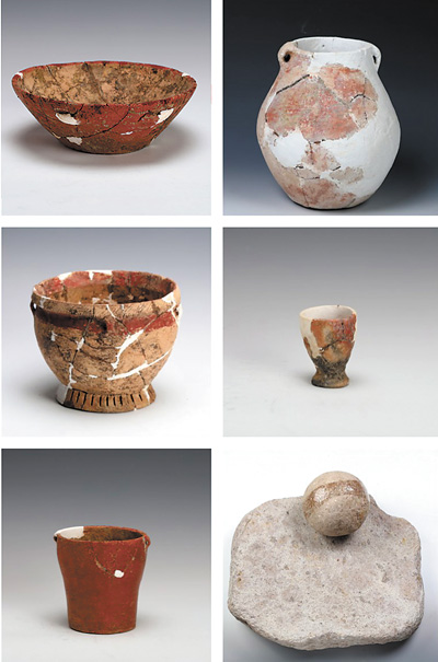 外圍人工土臺一般用純凈的黃褐色黏土堆筑而成,大多呈東西向的長方形。土臺上目前已揭露房址2處、灰坑23座、器物坑28座、高等級墓葬3座。墓葬的墓坑呈長方形,東西向或南北向。隨葬陶器較多,均在20件以上,主要有平底罐、圈足罐、大口盆等,有的墓葬還隨葬石器。從隨葬品的數(shù)量看,等級較高,說明在稻作農(nóng)業(yè)經(jīng)濟(jì)的支撐下,距今9000年左右,上山文化社會較早地出現(xiàn)了社會分化。