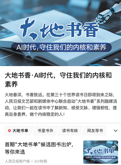 習(xí)近平總書記在今年全國兩會期間的重要講話中指出“書香是一種氛圍”“數(shù)字閱讀要和傳統(tǒng)閱讀結(jié)合起來,守住我們的內(nèi)核和素養(yǎng)”。在第三十個(gè)世界讀書日即將到來之際,人民日報(bào)社文藝部和新媒體中心聯(lián)合啟動“大地書香”系列融媒活動,并圍繞“AI時(shí)代,守住我們的內(nèi)核和素養(yǎng)”推出首期“大地書單”。來自出版、文藝、科技、教育等不同領(lǐng)域的20位薦書人,推薦出35本候選圖書,在人民日報(bào)客戶端“大地書香”專題予以集中呈現(xiàn),參照網(wǎng)友的評論與推薦,最終推選出10本上榜圖書。讓我們多讀書、讀好書,一起在氤氳著書香的大地上行穩(wěn)致遠(yuǎn)。
