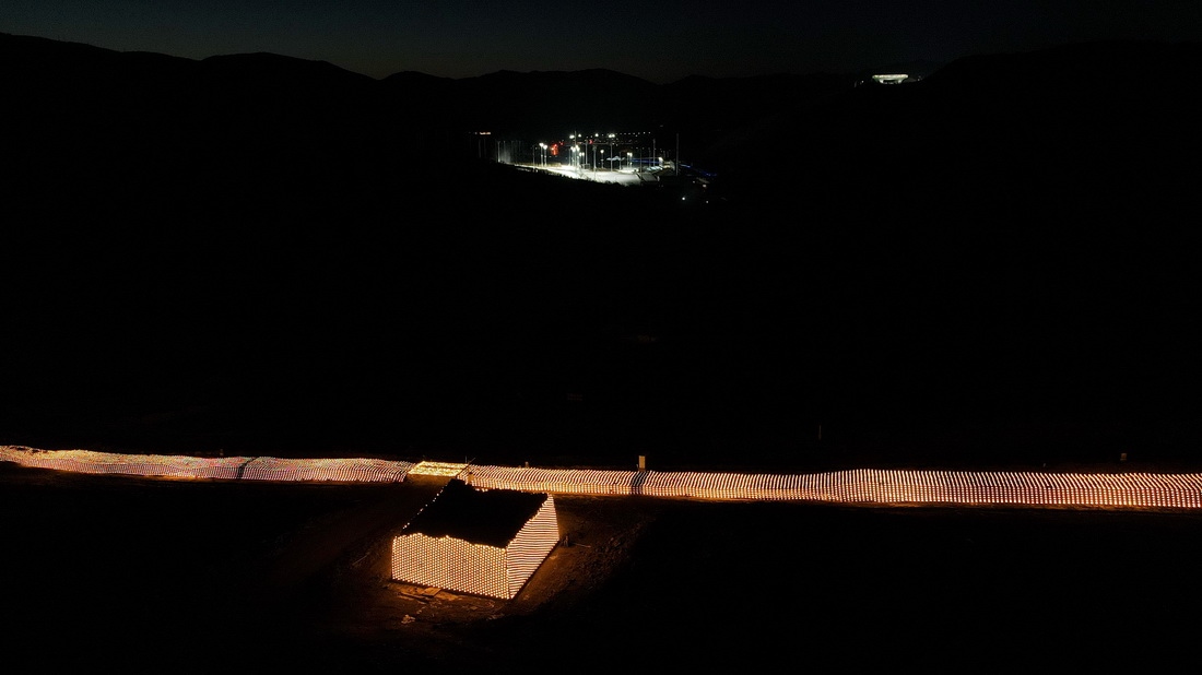 這是12月30日拍攝的崇禮長城景觀展示亮化工程現(xiàn)場,遠(yuǎn)處為國家越野滑雪中心和國家跳臺(tái)滑雪中心(無人機(jī)照片)。新華社記者 牟宇 攝