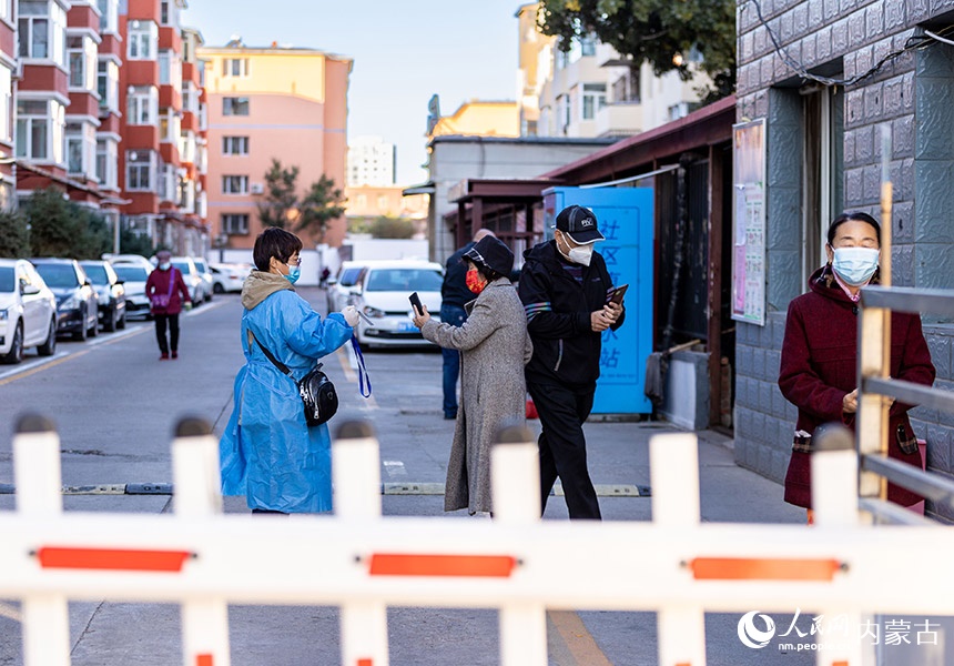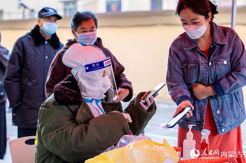 呼和浩特市玉泉區(qū)一處住宅小區(qū),社區(qū)網(wǎng)格員在查驗(yàn)準(zhǔn)備去核酸檢測(cè)點(diǎn)居民的健康碼。丁根厚攝