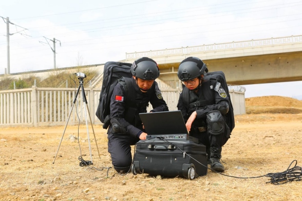 特警信息組對附近地形進(jìn)行勘測 湯彥冬 攝