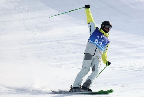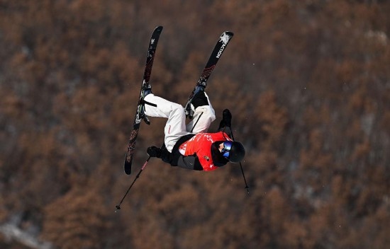 2月17日,內(nèi)蒙古隊(duì)選手楊昊在比賽中慶祝,他以174.75分的成績(jī)獲得冠軍。新華社記者 王楷焱 攝