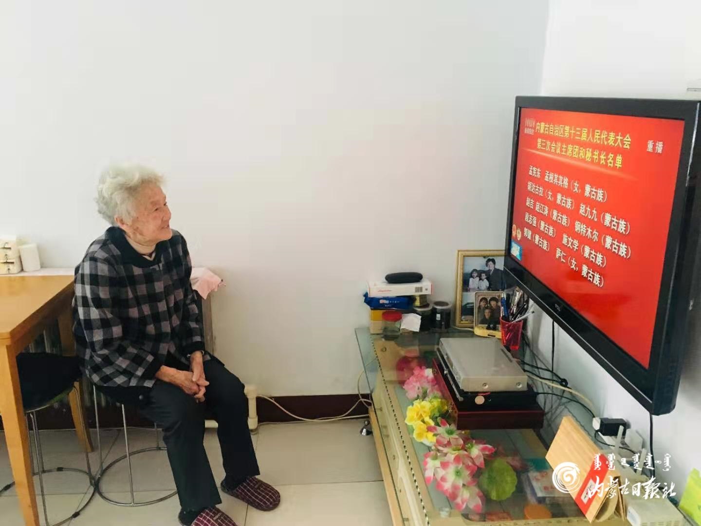 濱河社區(qū)82歲的老黨員田炬恒觀看自治區(qū)十三屆人大三次會議開幕直播。