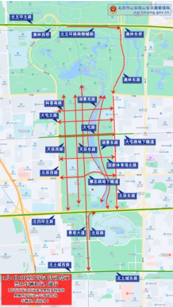 五、19時(shí)至開幕式結(jié)束,北四環(huán)路北側(cè)輔路(安慧橋至北辰西橋),除持有開幕式P5停車場專用證件的車輛和相關(guān)證件的人員外,禁止其他車輛和行人通行。