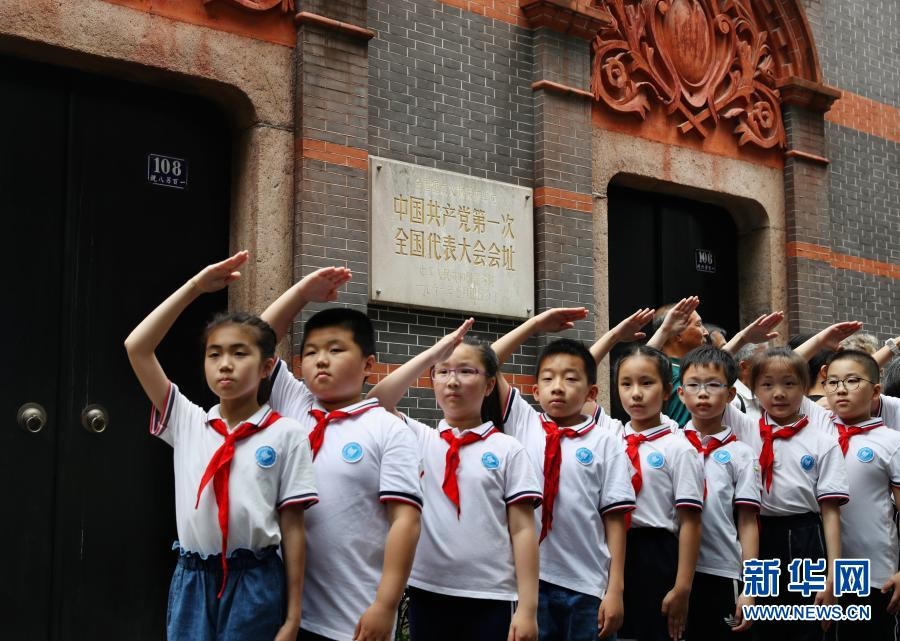 在中共一大會址前,上海市復旦萬科實驗學校的少先隊員們在參觀后合影留念(2019年6月27日攝)。新華社記者 劉穎 攝