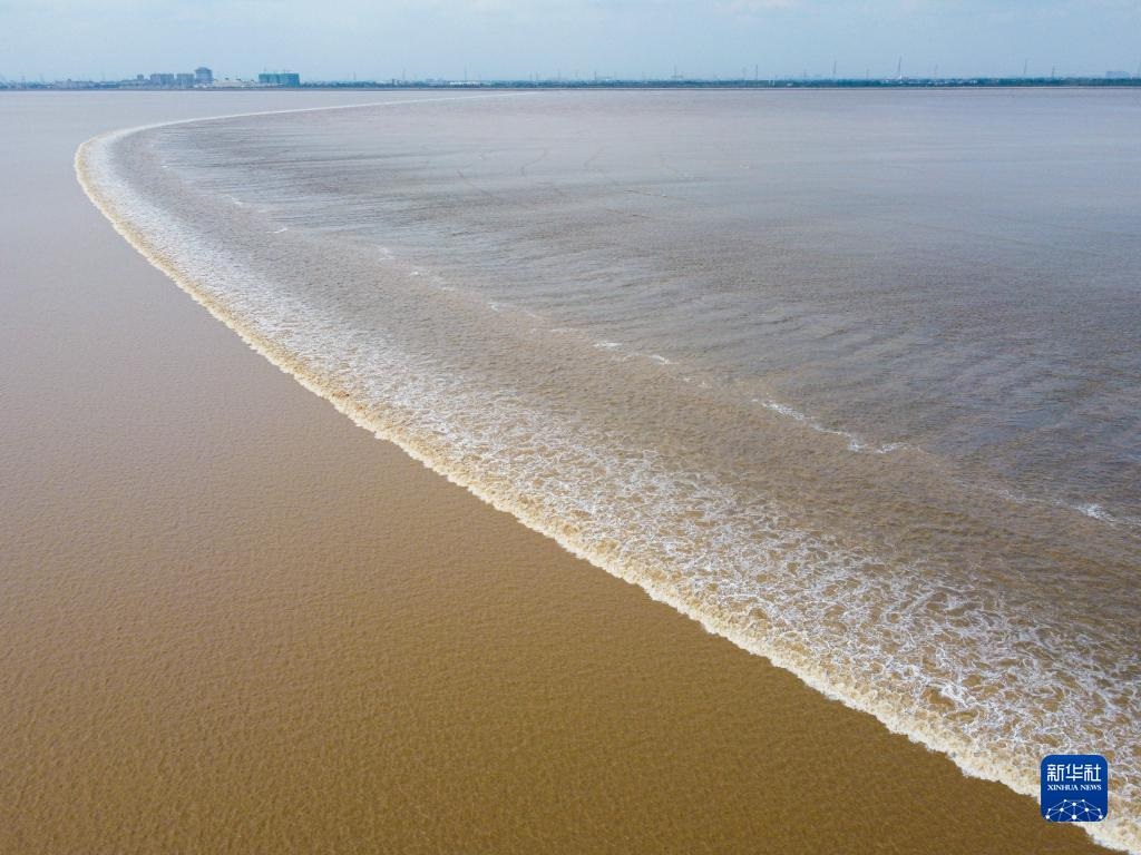這是在杭州市錢塘新區(qū)拍攝的錢塘江一線潮奇觀(2020年10月5日攝,無(wú)人機(jī)照片)。新華社記者 江漢 攝