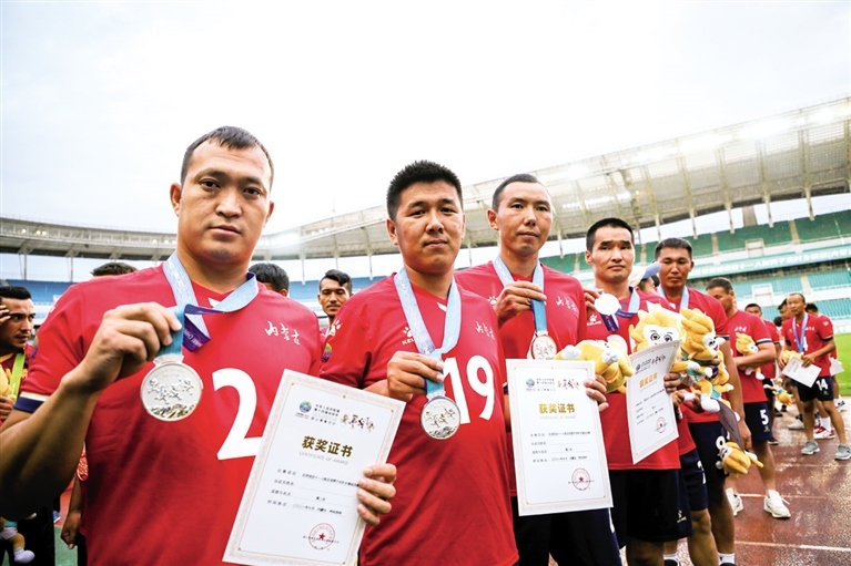 7月26日,內(nèi)蒙古隊球員展示銀牌。當(dāng)日,第十四屆全國運(yùn)動會群眾比賽足球項目十一人制男子農(nóng)村鄉(xiāng)鎮(zhèn)組決賽在大雨中開戰(zhàn)。最終經(jīng)過90分鐘的爭奪,代表內(nèi)蒙古出戰(zhàn)的錫尼河鎮(zhèn)隊與陜西隊?wèi)?zhàn)成1:1平,在隨后進(jìn)行的點(diǎn)球大戰(zhàn)中,內(nèi)蒙古隊2:4不敵對手,獲得該項目的亞軍。(攝影/北方新報正北方網(wǎng)記者 牛天甲)